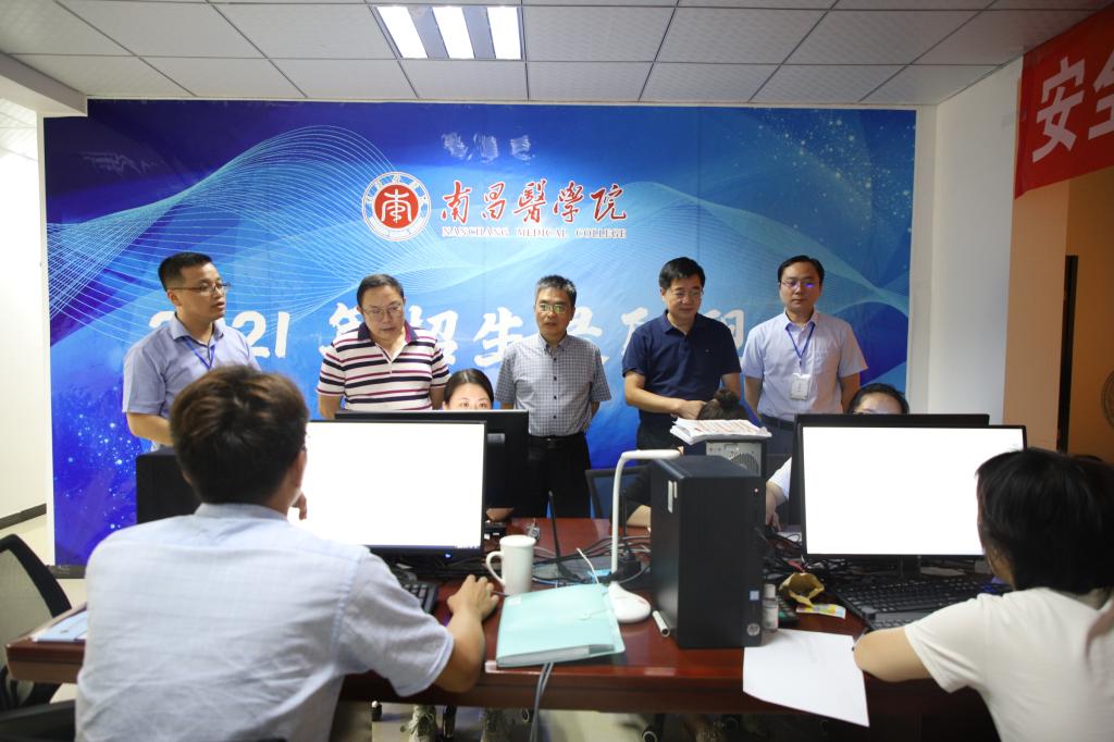 (通讯员何思佳)7月26日,江西省卫健委二级巡视员,88038威尼斯(筹建期)党委委员、副校长李志刚,党委委员、副校长胡振宇在相关部门负责人的陪同下赴88038威尼斯湾里校区2021年招生录取工作现场,看望慰问暑期忙碌在招生录取现场的工作人员,了解招生录取工作进展状况,指导招生录取工作。