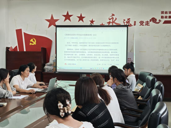 为强化警示教育,党支部重点学习了“八项规定改变中国”系列材料及2起党员干部违规吃喝典型问题的通报。通过剖析案例中“舌尖上的腐败”“节日病”等违纪行为,党员们深刻认识到“微腐败”的危害性。周洁强调:“纪律红线不可触碰,必须从一顿饭、一杯酒等小事小节上严起,坚决杜绝侥幸心理。”